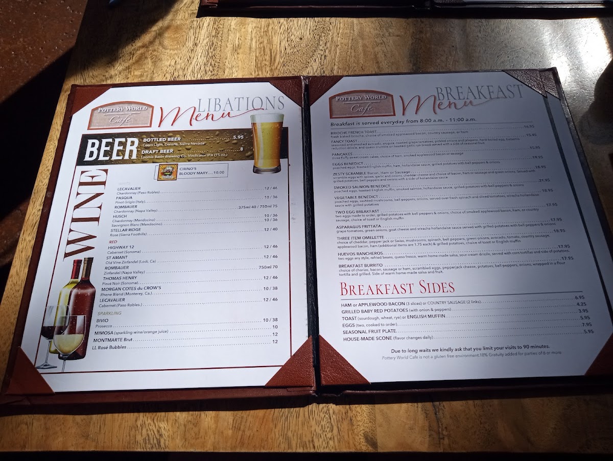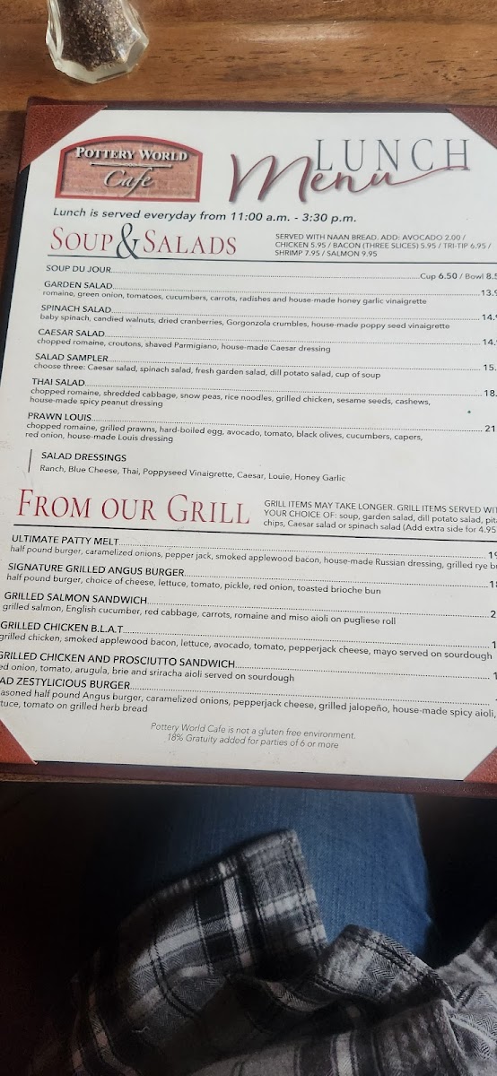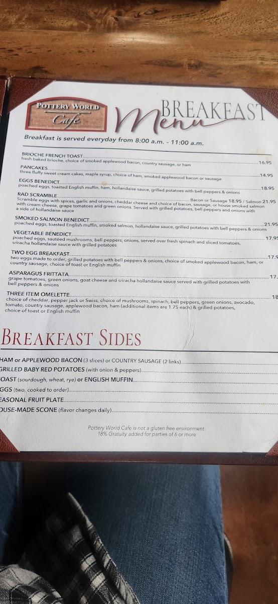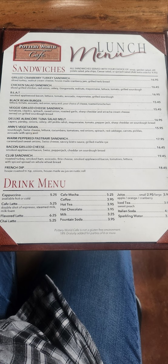 The menu at Pottery World Cafe is thoughtfully organized to cater to breakfast, brunch, and lunch preferences, featuring a diverse selection of dishes alongside coffee and dessert options. It is designed to accommodate casual dining with a focus on light meals, sandwiches, salads, and traditional breakfast items.