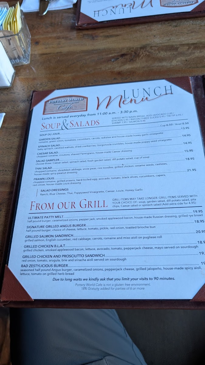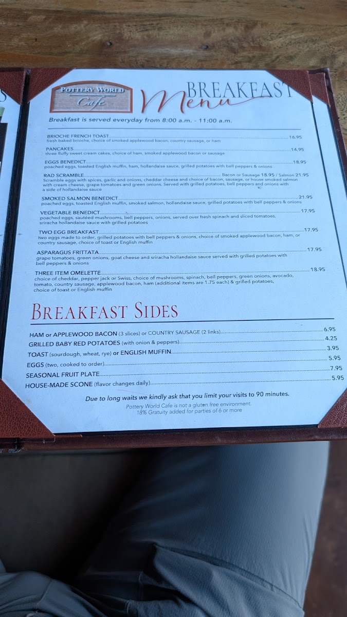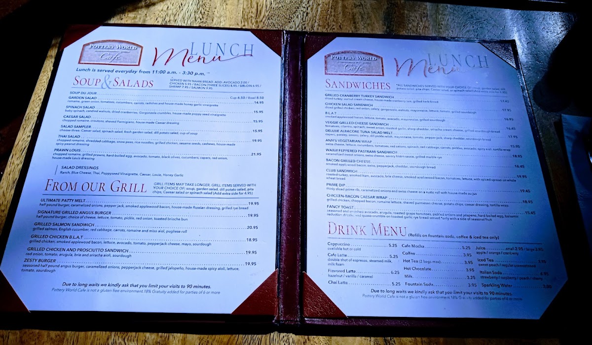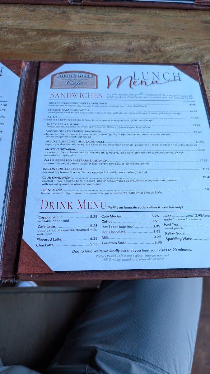 The menu at Pottery World Cafe is thoughtfully organized to cater to breakfast, brunch, and lunch preferences, featuring a diverse selection of dishes alongside coffee and dessert options. It is designed to accommodate casual dining with a focus on light meals, sandwiches, salads, and traditional breakfast items.
